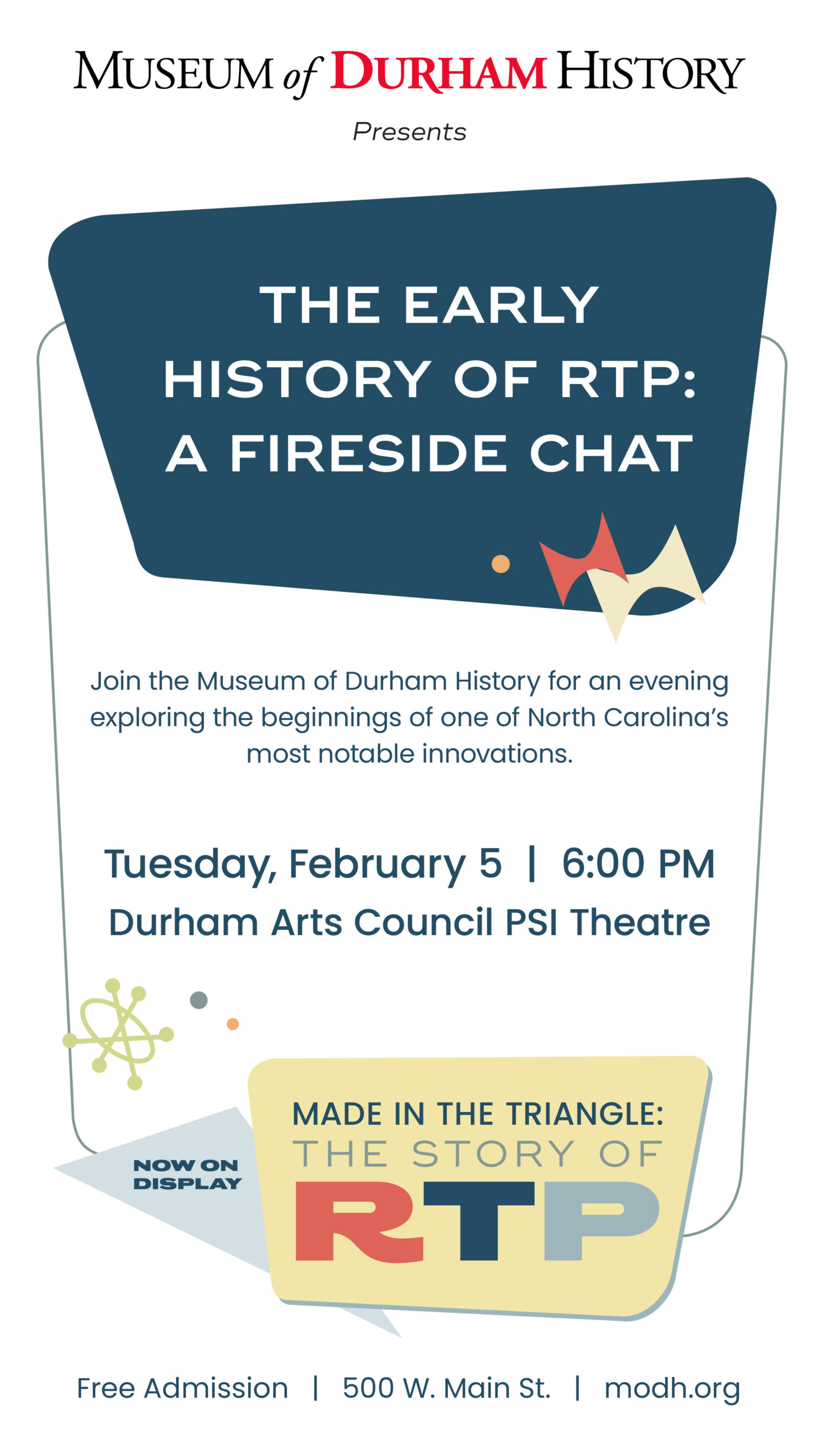 On Thursday, February 5, we’re heading across the street to Durham Arts Council’s PSI Theater (120 Morris Street) and invite you to join us for an evening of conversation and discovery, exploring the origins of one of North Carolina’s most influential innovations, Research Triangle Park. Beginning… Read More