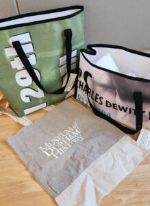 As a token of our appreciation, donors of $60+ will receive a Museum-branded canvas tote bag, and donors of $125+ will receive a one-of-a-kind waterproof vinyl tote made from repurposed exhibit banners—unique, durable, and perfect for gifting!